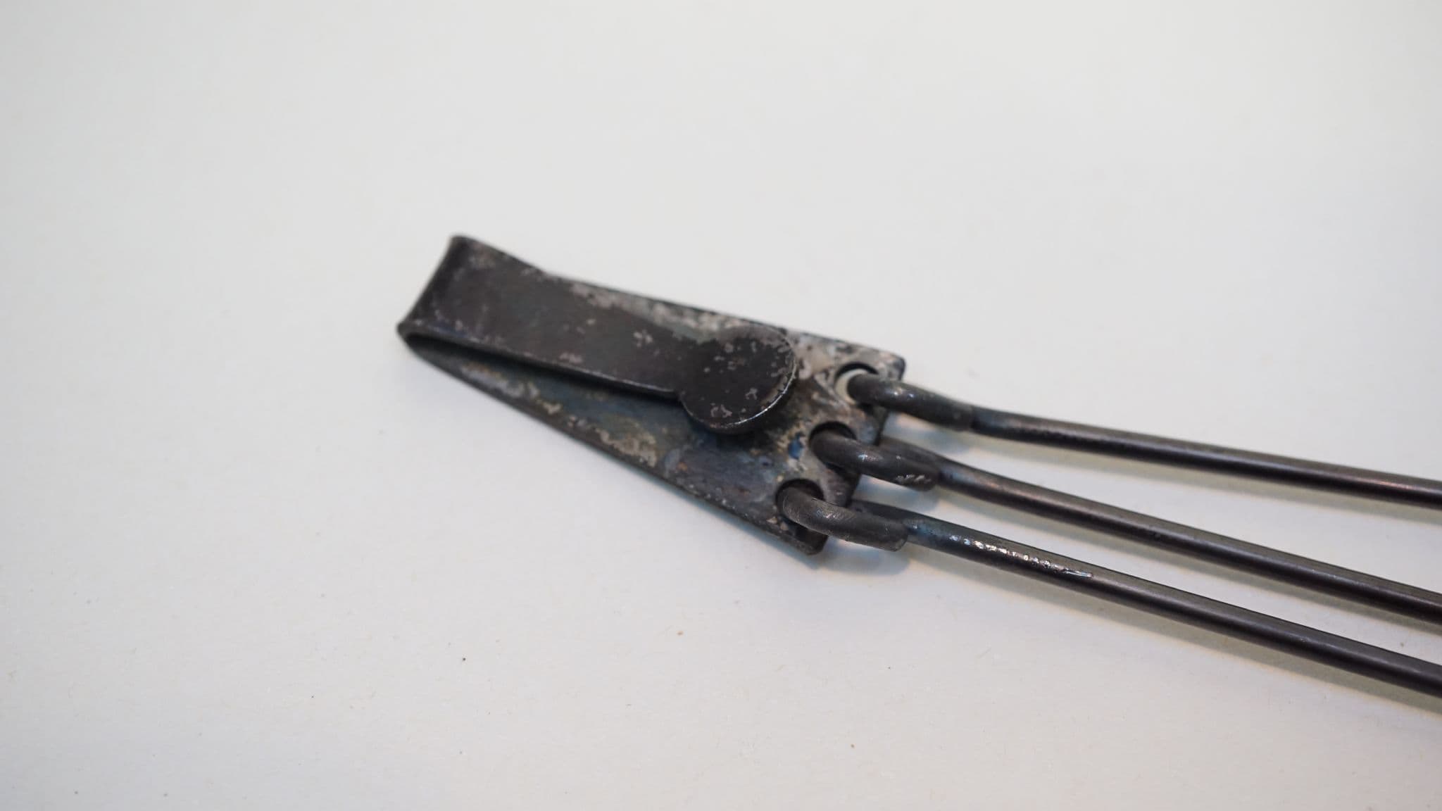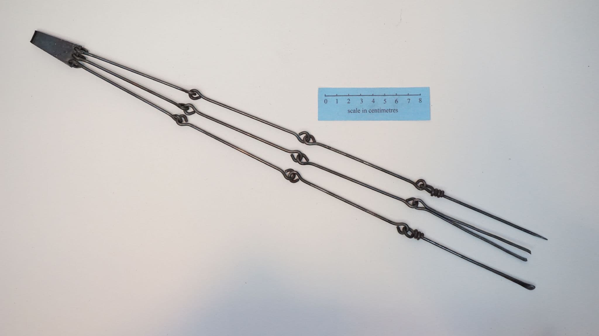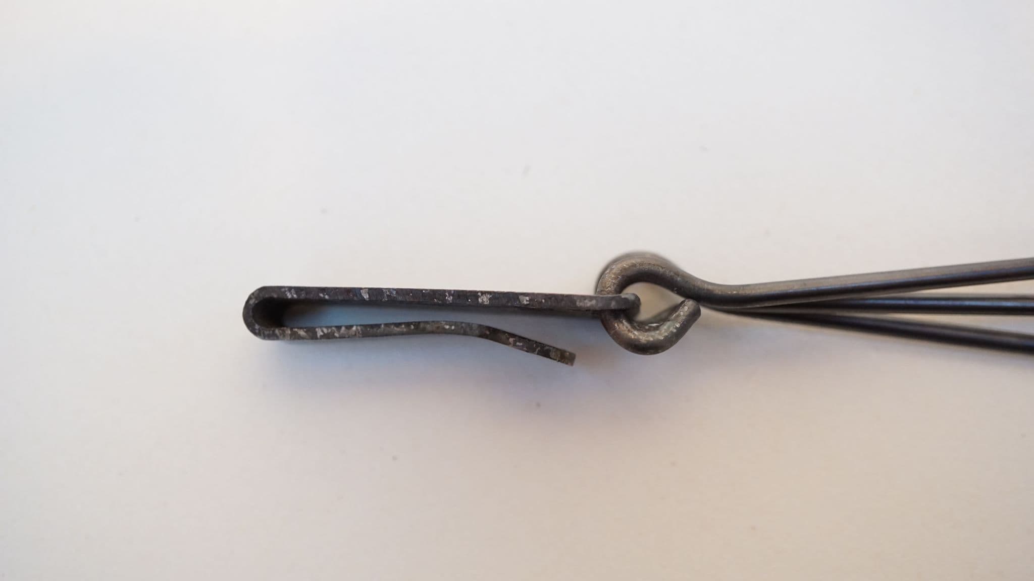 this chatelaine is a reconstruction based on the fragmentary finds from Gilton Anglo-Saxon cemetery (7th century) with added tweezers, pricker and spoon all in forged steel so it is not totally accurate, the chatelaine is secured to a belt with the belt clip and is based on the description and drawings in Faucett's Inventorium Sepulchrale (1757-1773). nominally 40cm long made in Sheffield England by Daegrad Tools