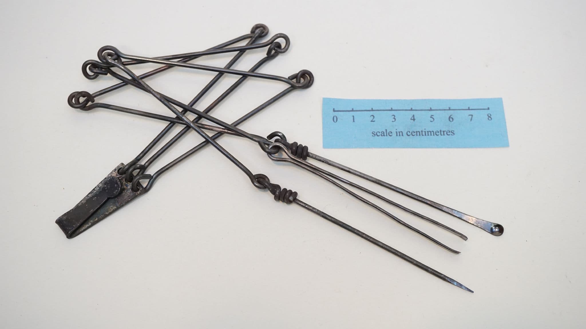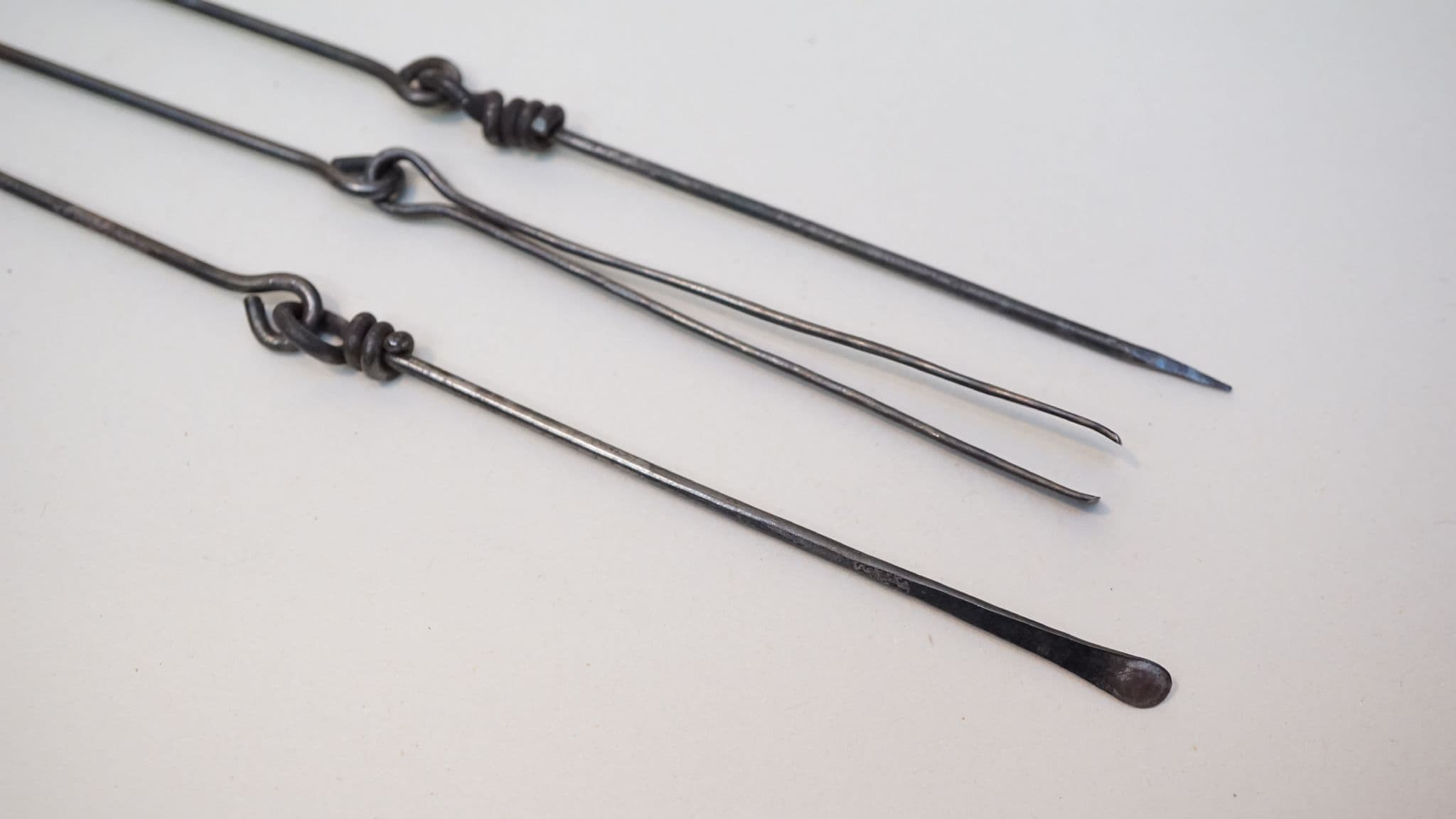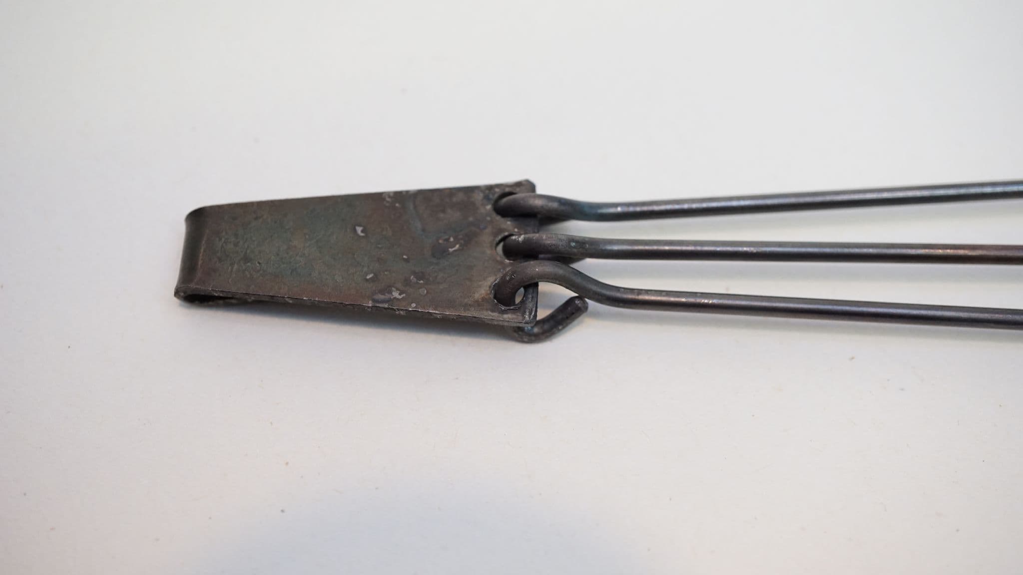this chatelaine is a reconstruction based on the fragmentary finds from Gilton Anglo-Saxon cemetery (7th century) with added tweezers, pricker and spoon all in forged steel so it is not totally accurate, the chatelaine is secured to a belt with the belt clip and is based on the description and drawings in Faucett's Inventorium Sepulchrale (1757-1773). nominally 40cm long made in Sheffield England by Daegrad Tools