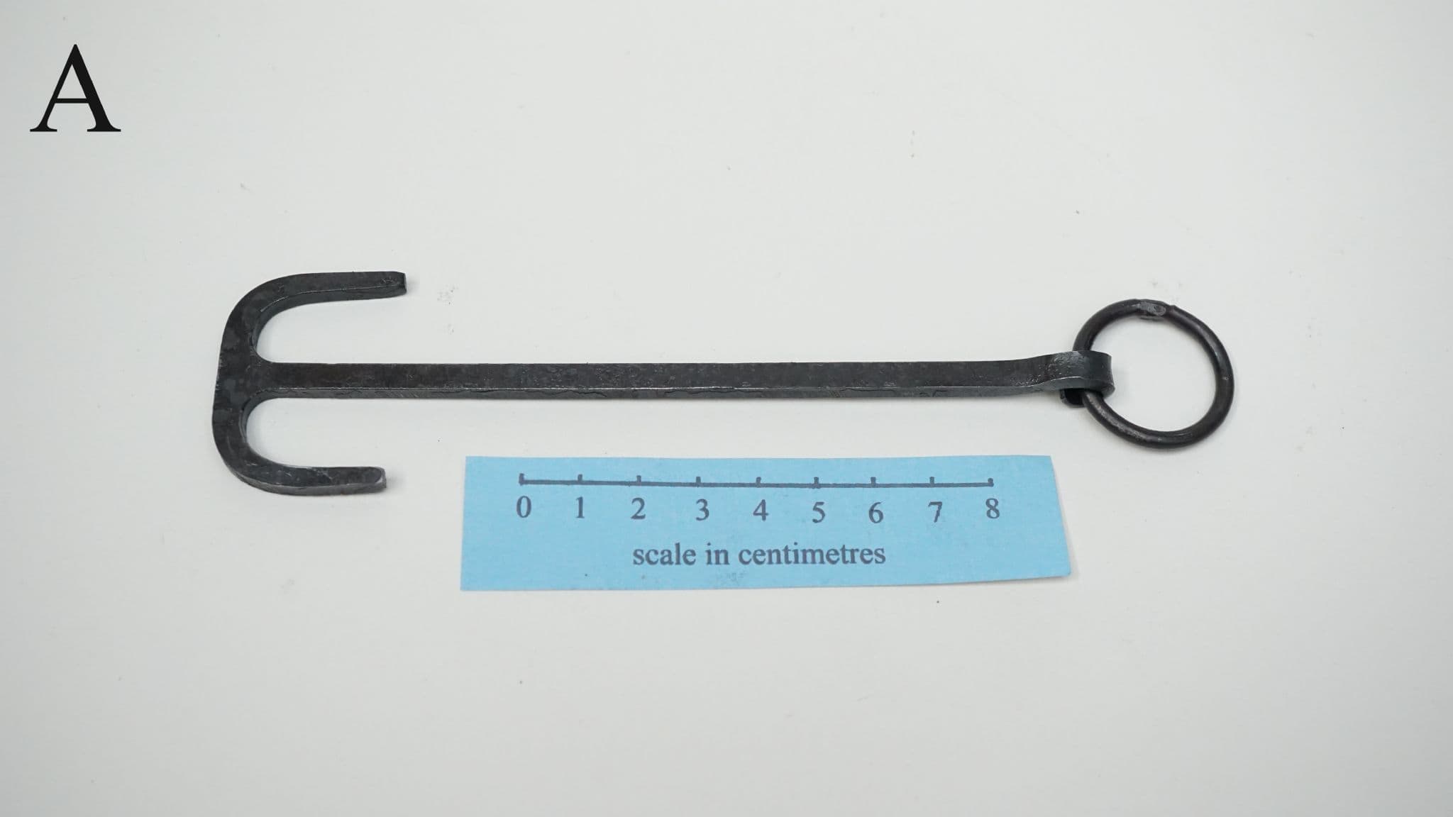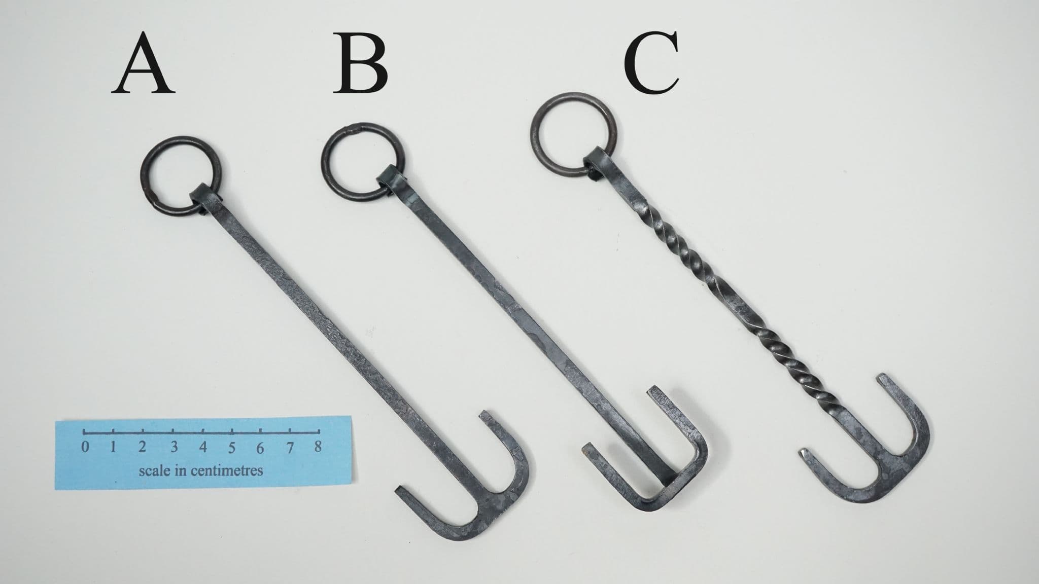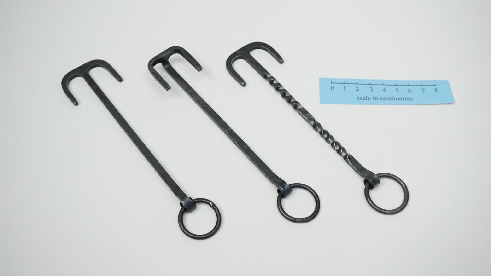 a choice of three hand forged steel latch lifters, keys or girdle hangers of the Anglo-Saxon period, each one supplied on a 22mm diameter 3mm thick steel split ring for belt suspension. based on the following finds;