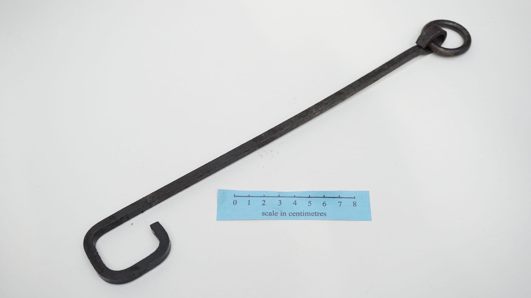 a hand forged 12" 300mm long square section pot hook based on find 1771 from flixborough occupation site in Lincolnshire, supplied with hanging ring, made from square section steel. made in Sheffield England by Daegrad Tools