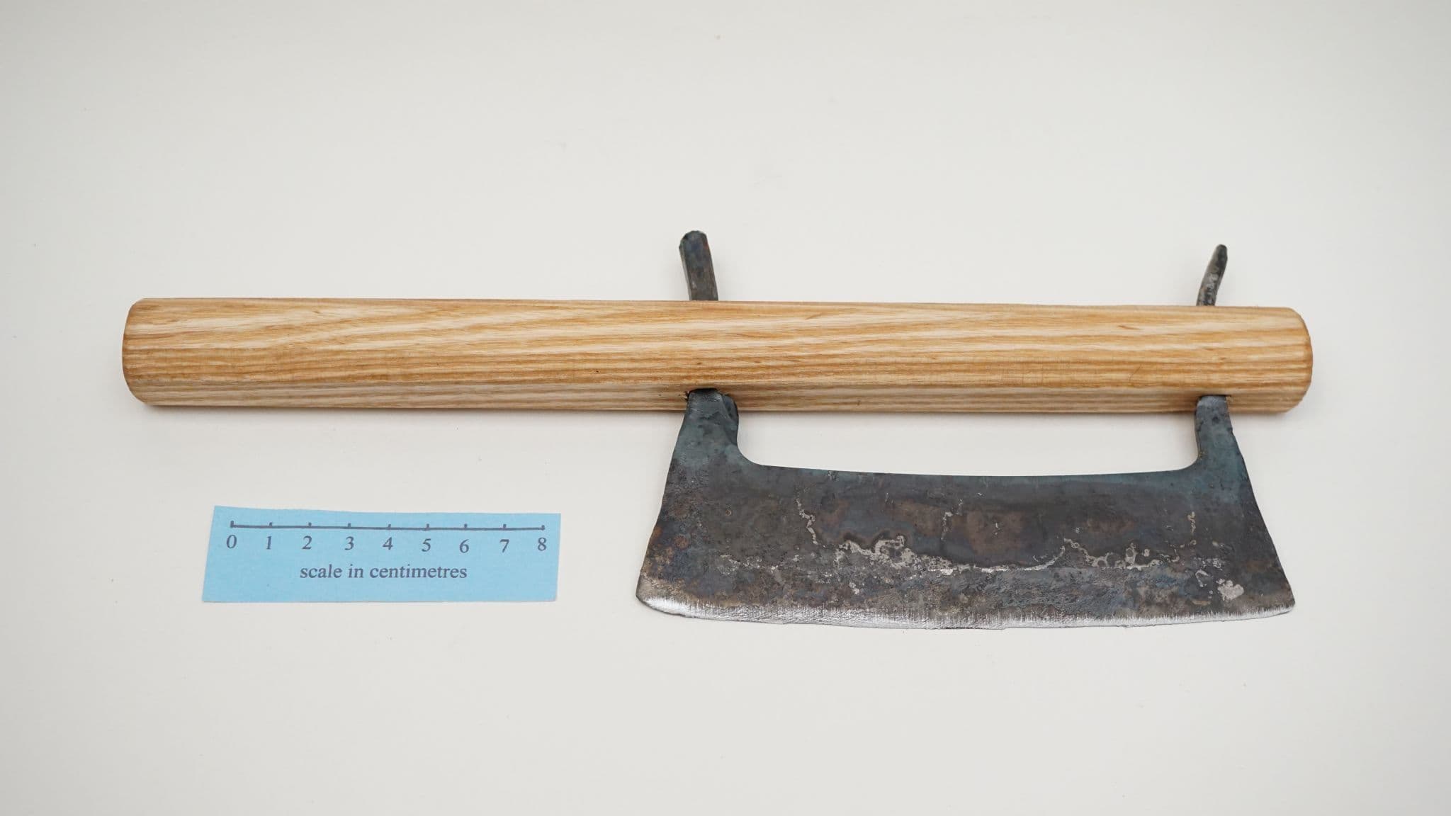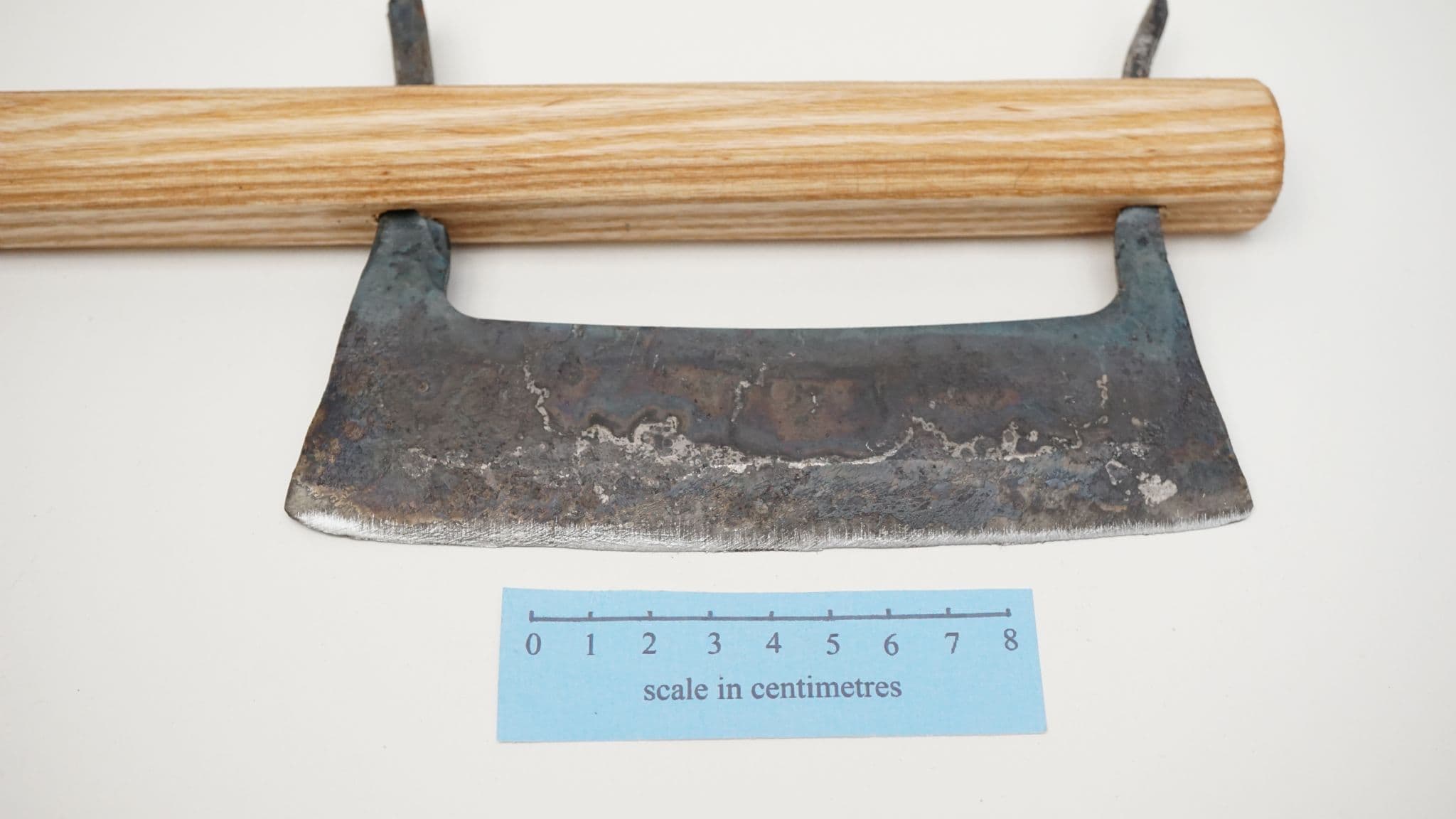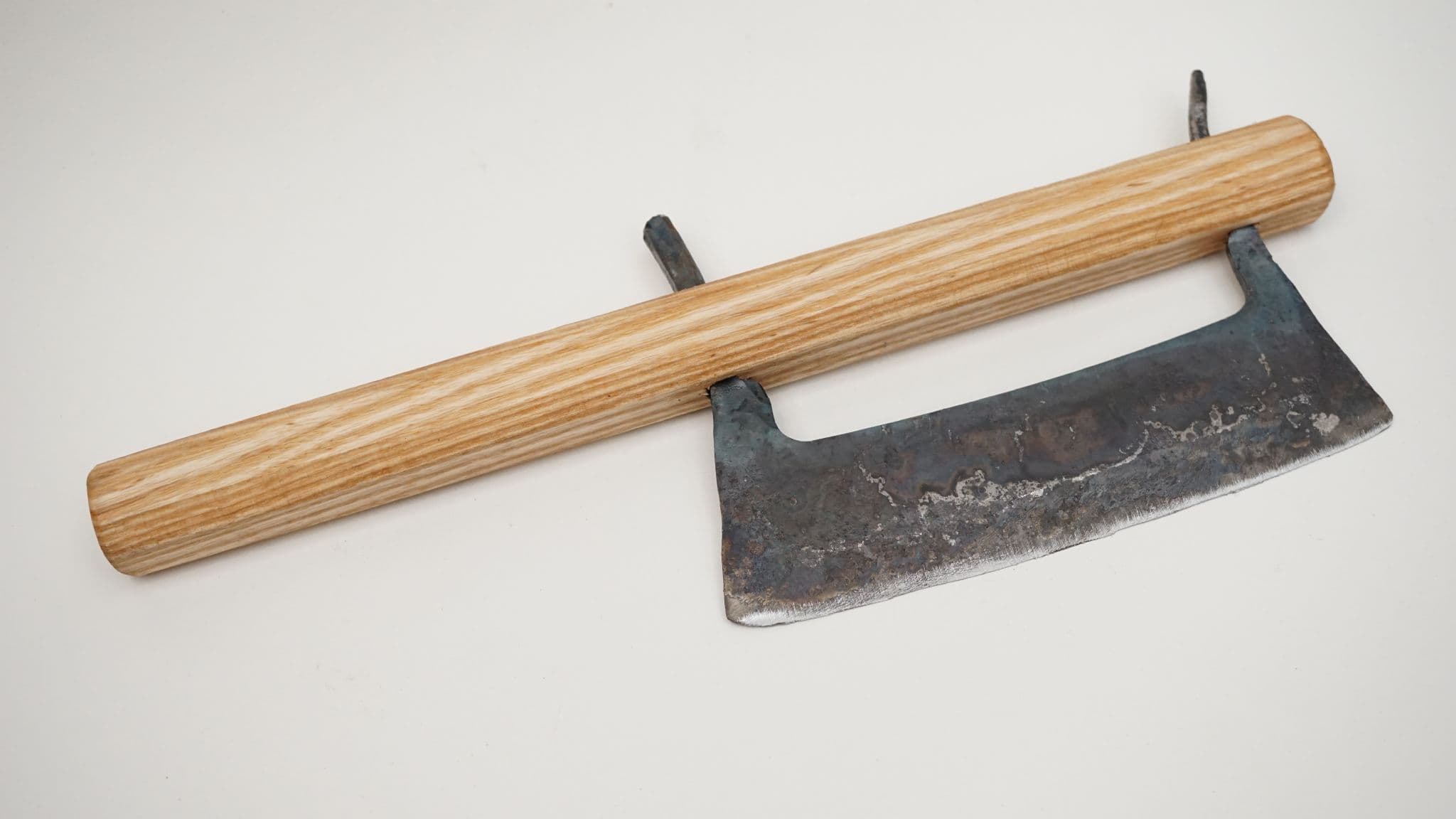 a hand forged Finnish style hakukirves hakokirves or havukirves 6" (150mm) cutting edge, made from water quenched S275JR steel (0.4% CEV steel equivalent ), designed for hand sharpening only, based on extant types used as fodder cutters in Estonia and Finland, supplied with ash wood handle and peigned over tangs. made in Sheffield England by Daegrad Tools