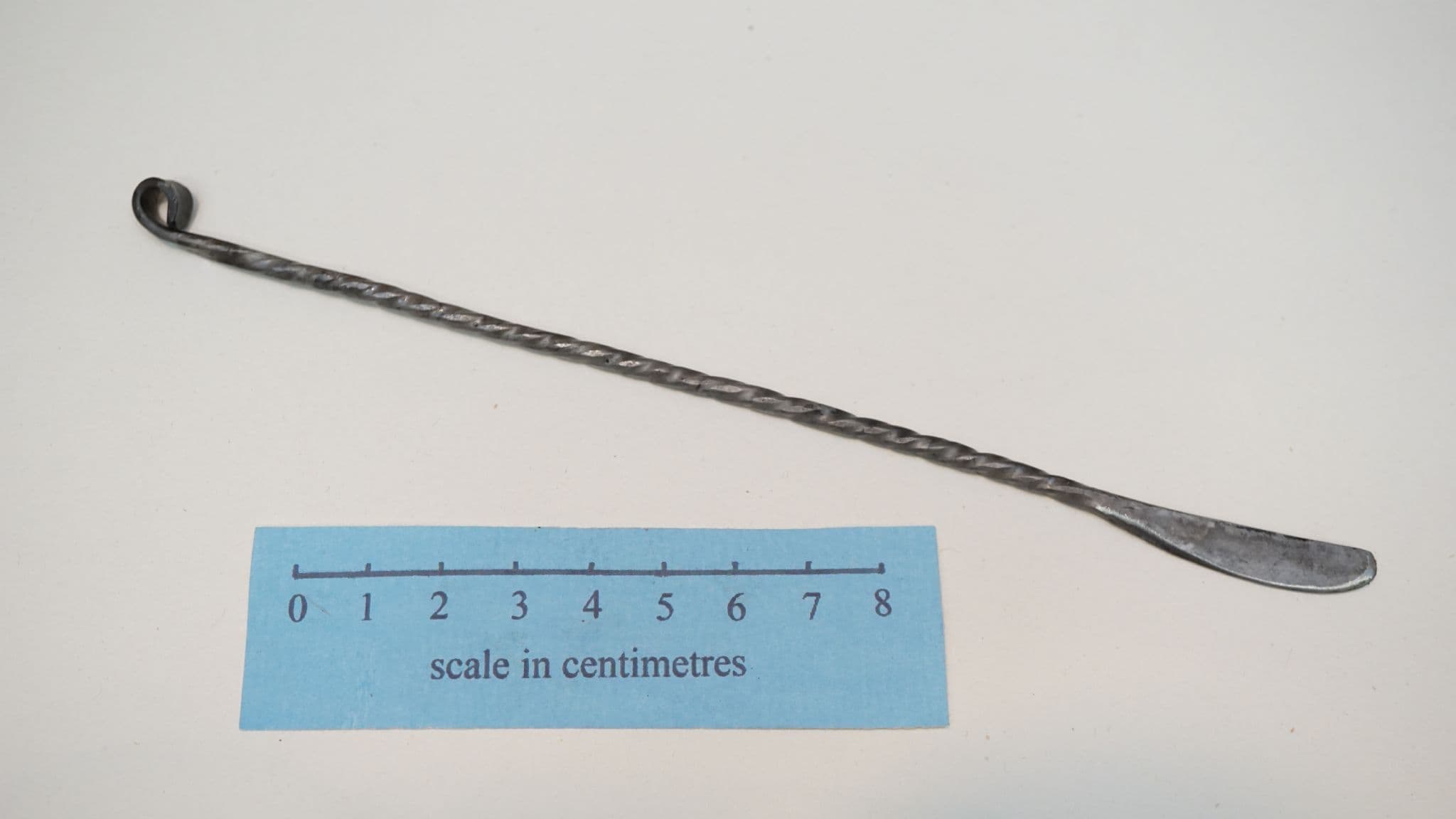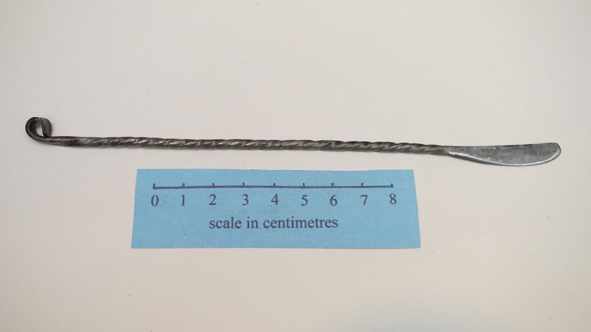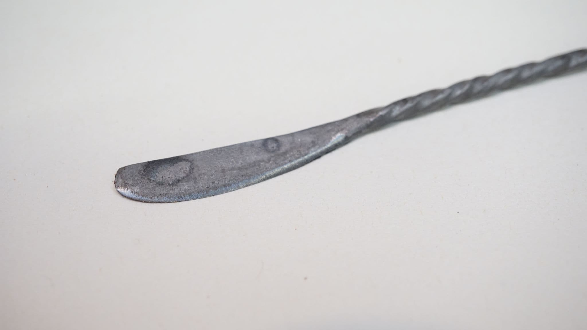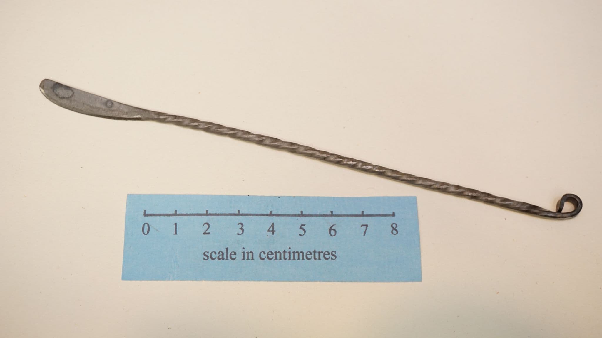 a hand forged surgical scalpel to a medieval style, 3mm diameter square twisted shaft with end loop and a forged steel blade nominally 25mm long, hardened and fully functional. made in Sheffield England by daegrad tools