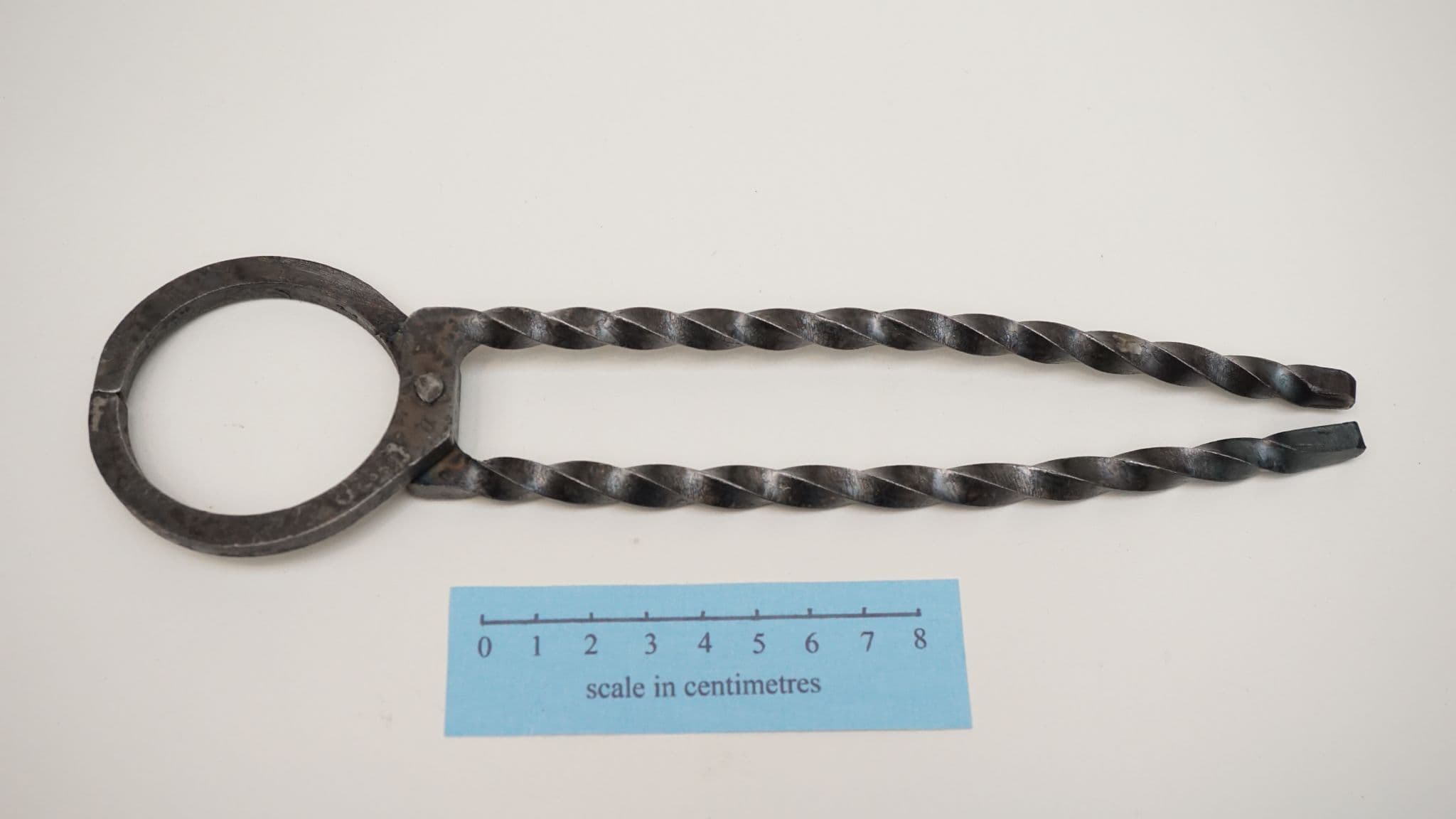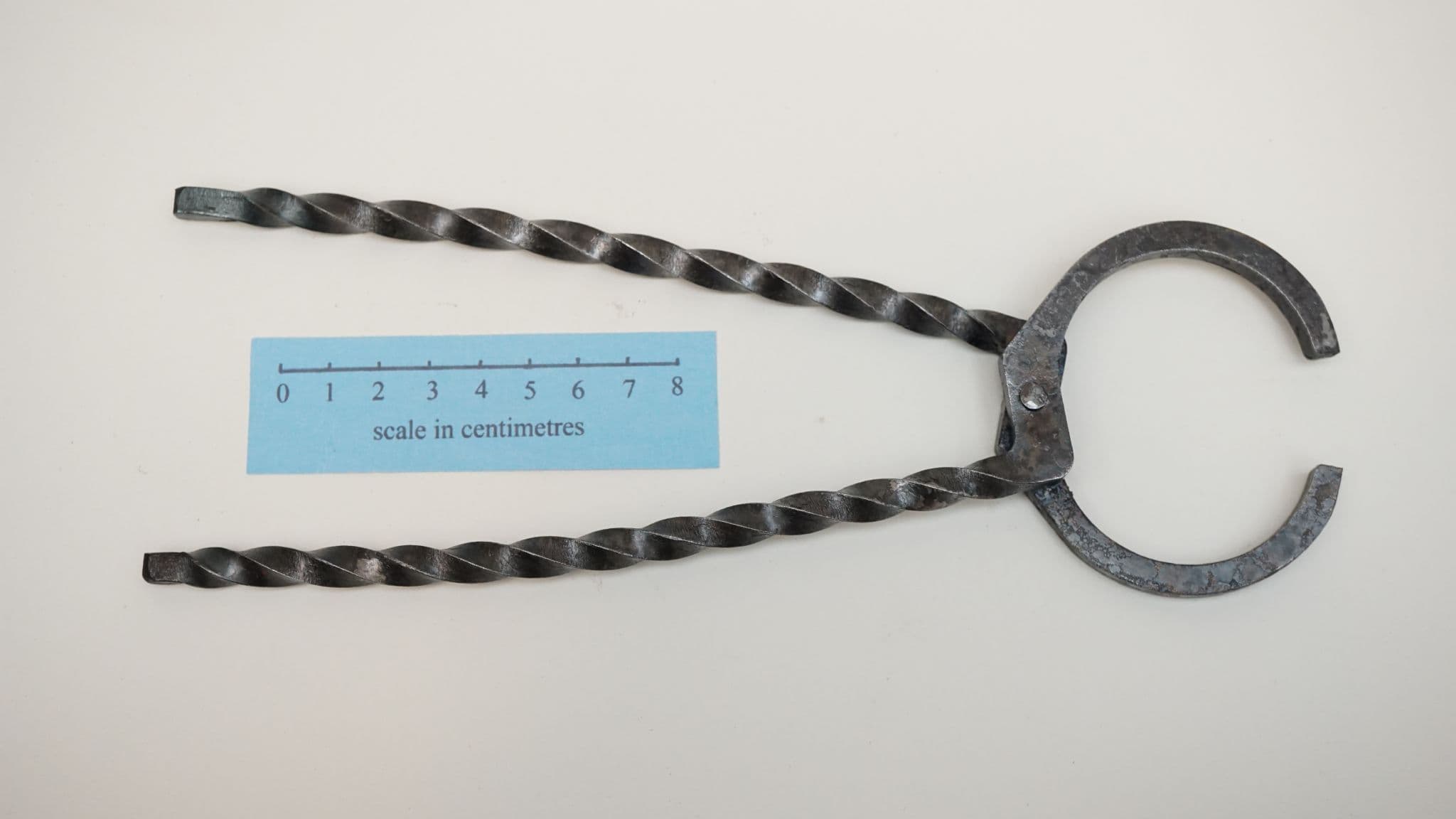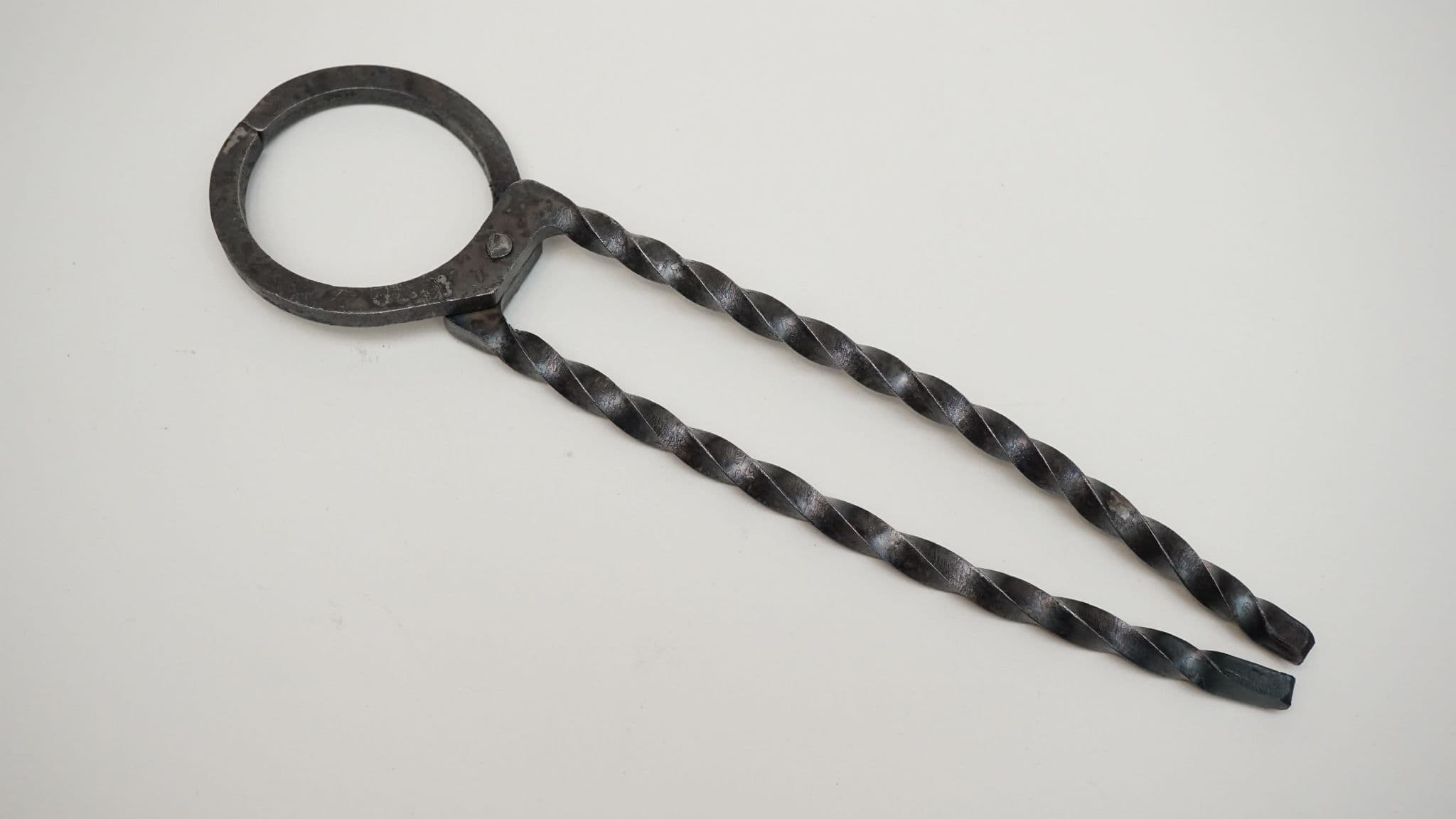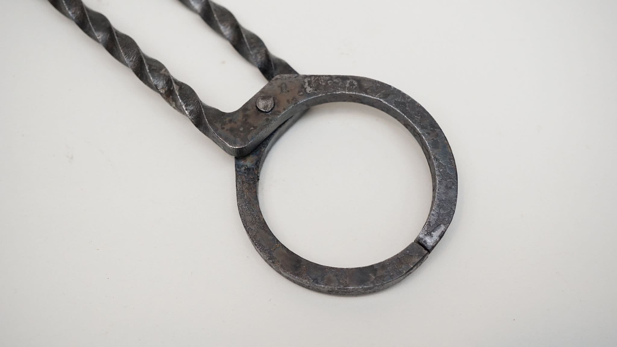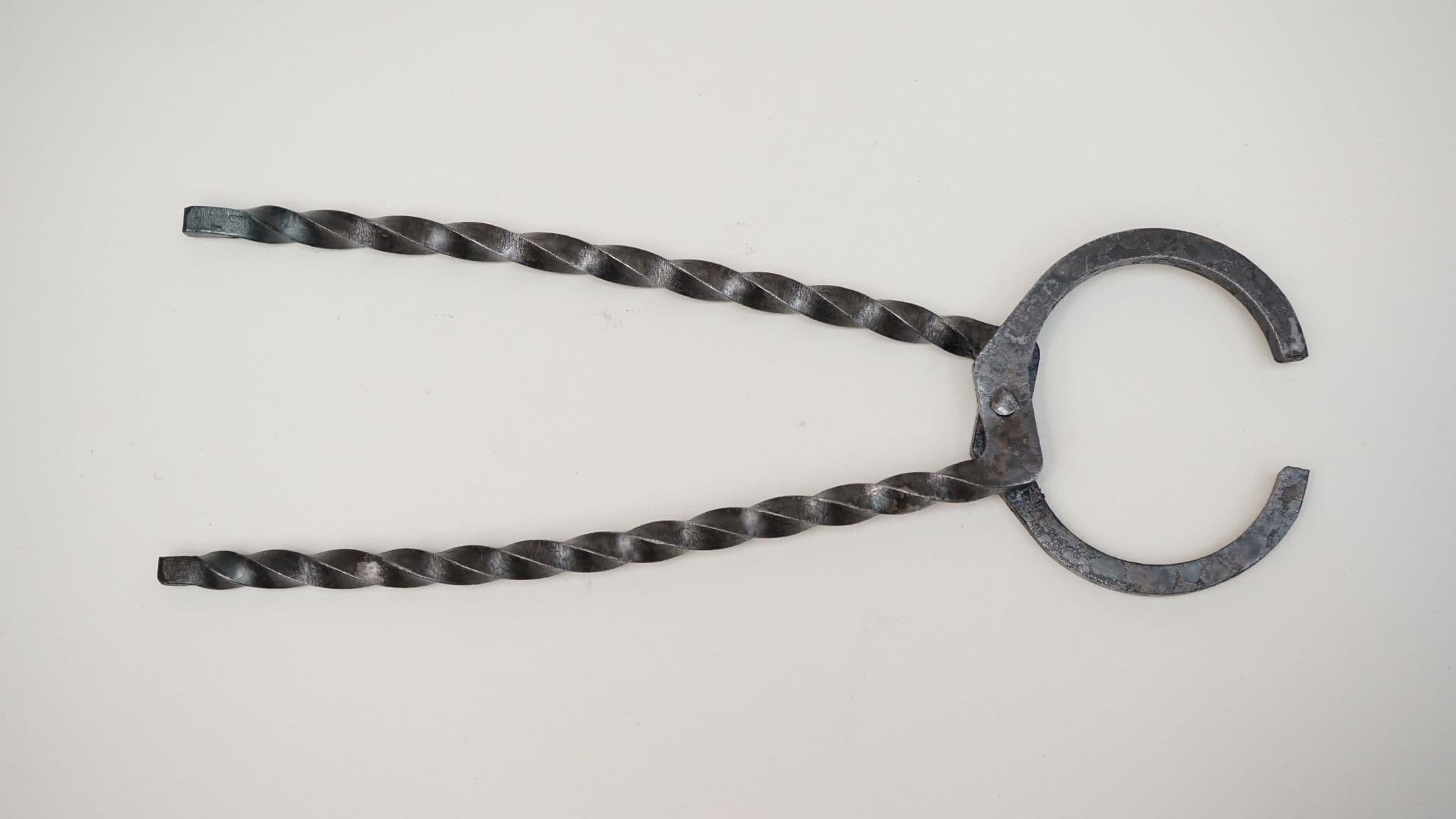 a hand forged set of pliers or tongs based on the Roman period based on the find from Camerton in Somerset (UK) 1-2nd C AD,hand forged twisted 6mm square section steel for living history reenactment use 10" (250mm) total length with 7" (175mm) handles for either surgical or industrial use (it is up to you!), made from 6mm square section water quenched S275JR steel. 4mm rivet. made in Sheffield England by Daegrad Tools. not designed for hot working.