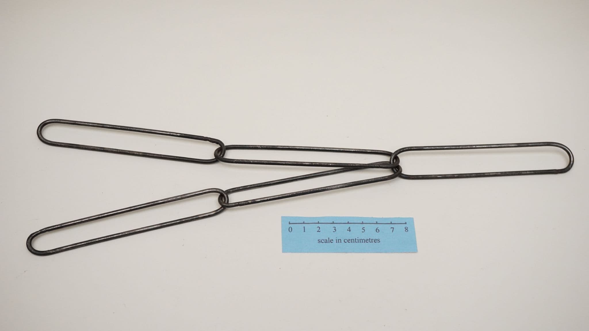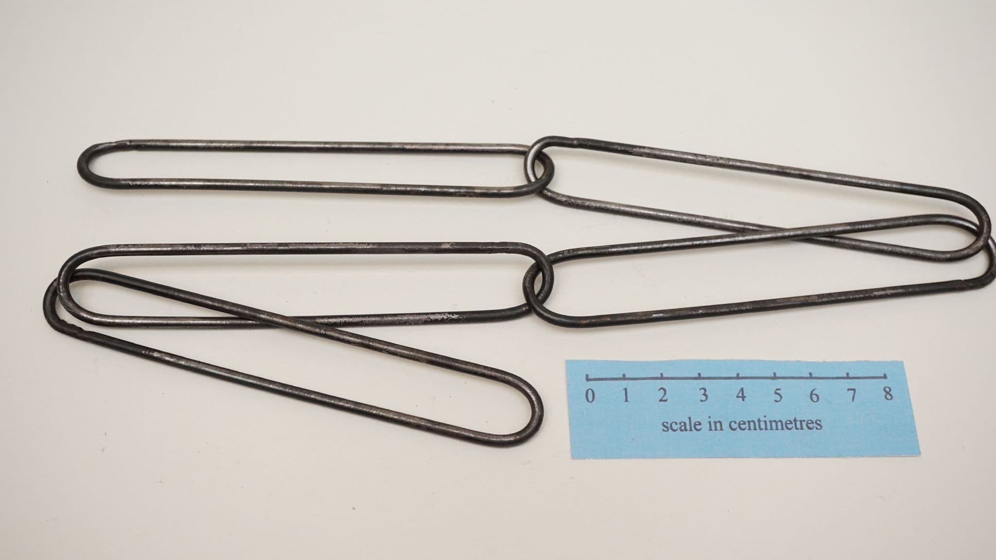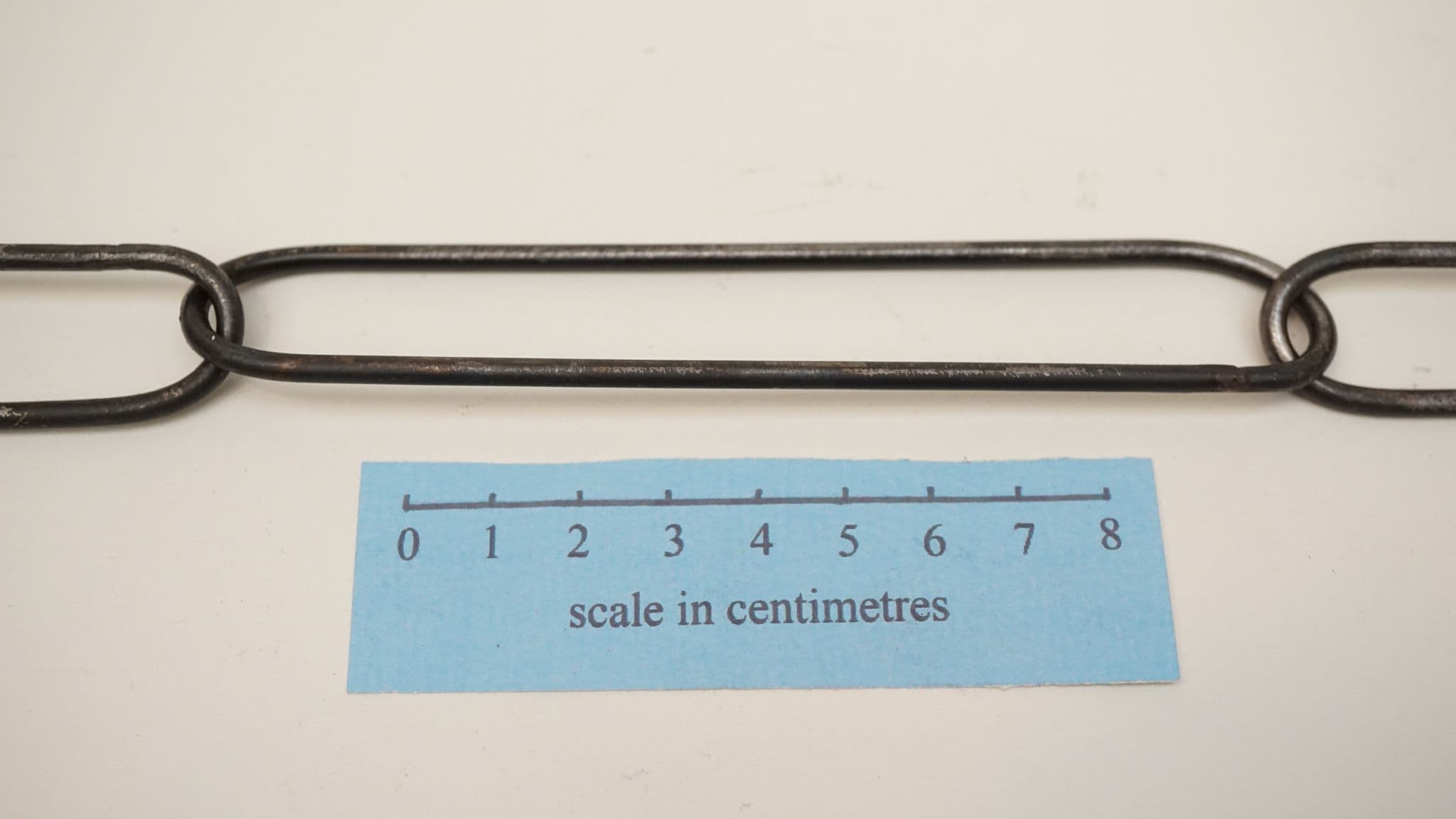 a 1m length (40") of hand forged and welded chain made from 3mm diameter steel made up of approximatly 9 lengths (5 shown in the photo) each link is nominally 20mm wide and 120mm long. designed for a variety of living history re-enactment uses to cover the Roman to the Medieval with a maximum weight load of 3Kg. made in Sheffield England by Daegrad Tools