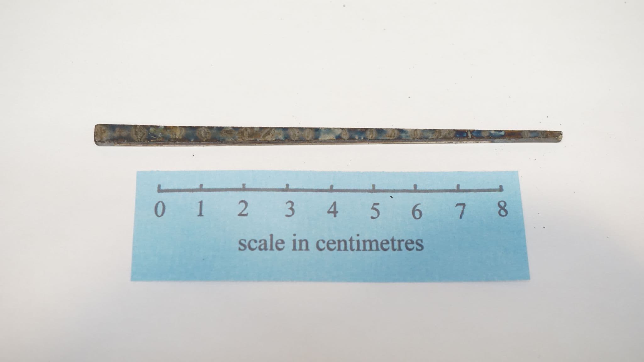 a set of 12 Glasgow nails, 11cm long, flat head 5x3mm tapering down to a 3x3mm square, made from water quenched S275JR steel, for living history woodworking applications. made in Sheffield England by Daegrad Tools
