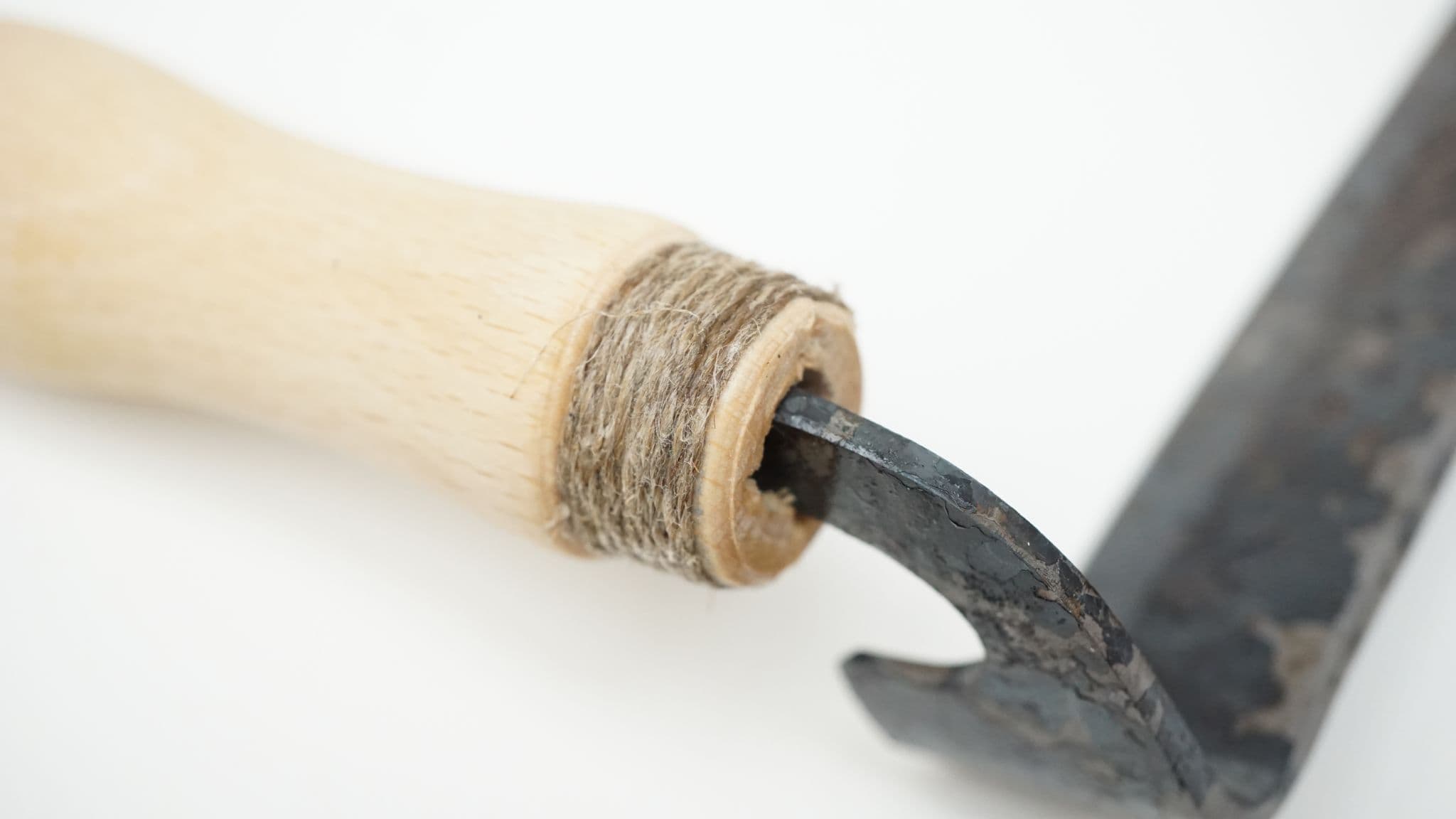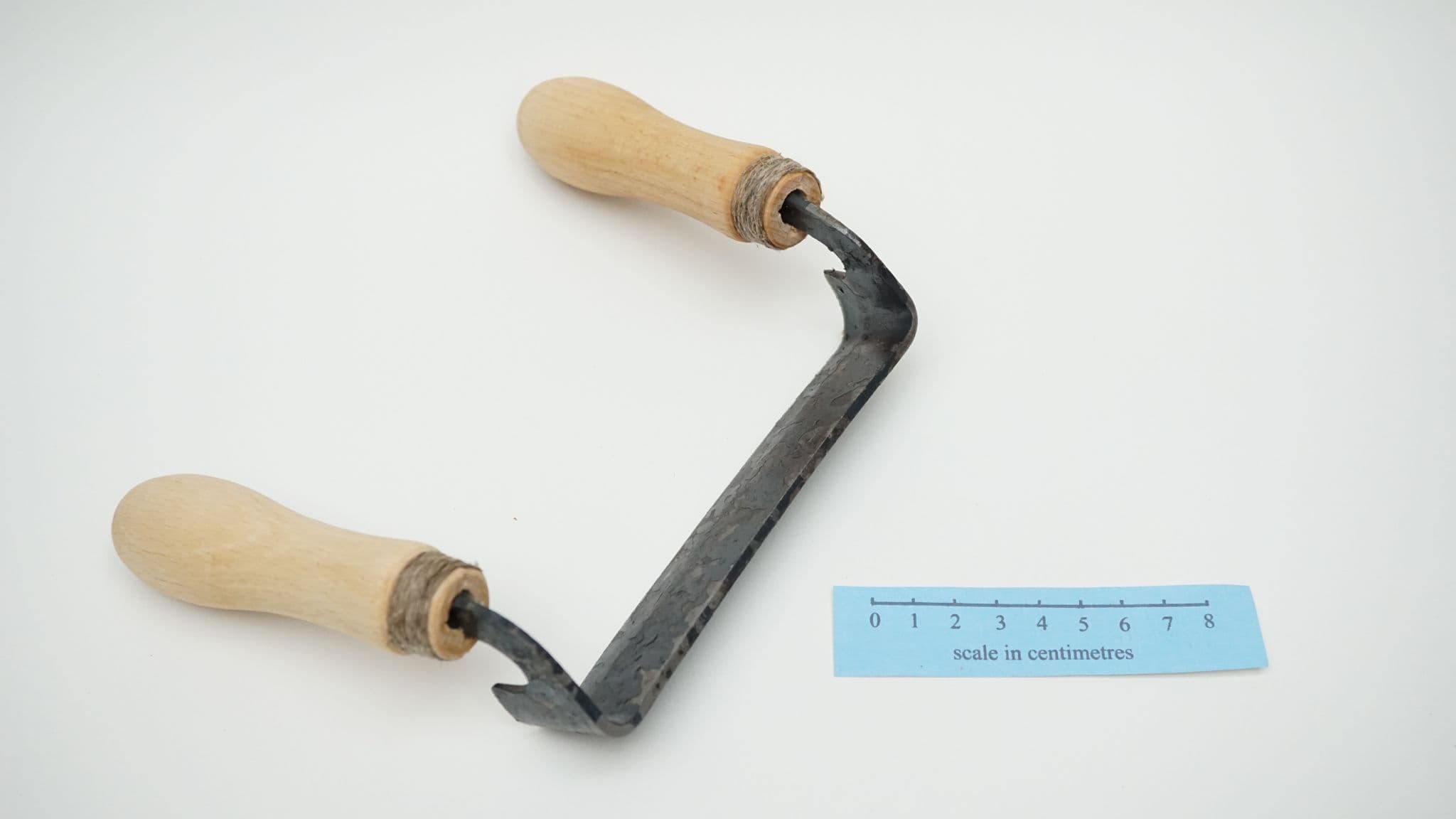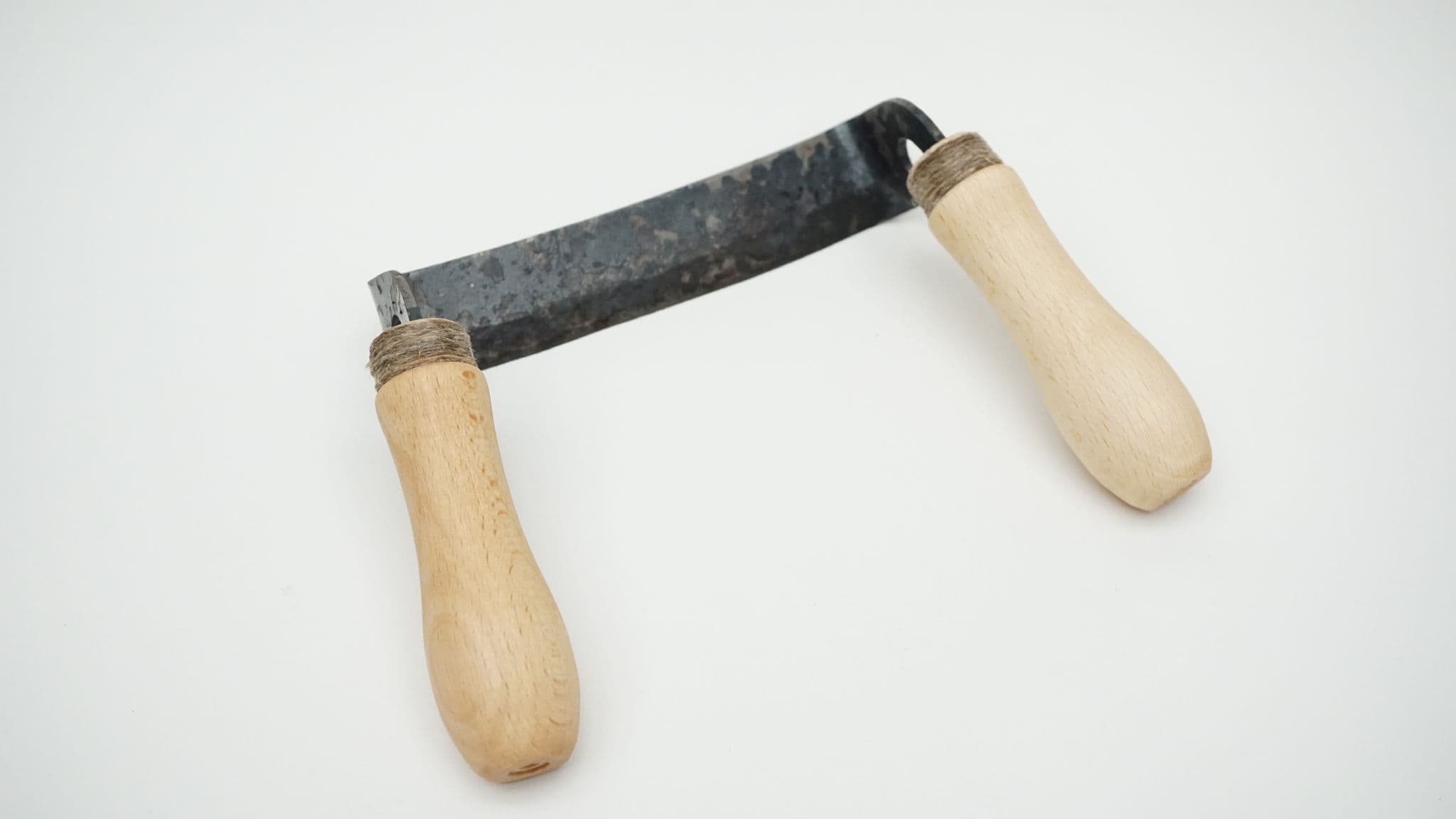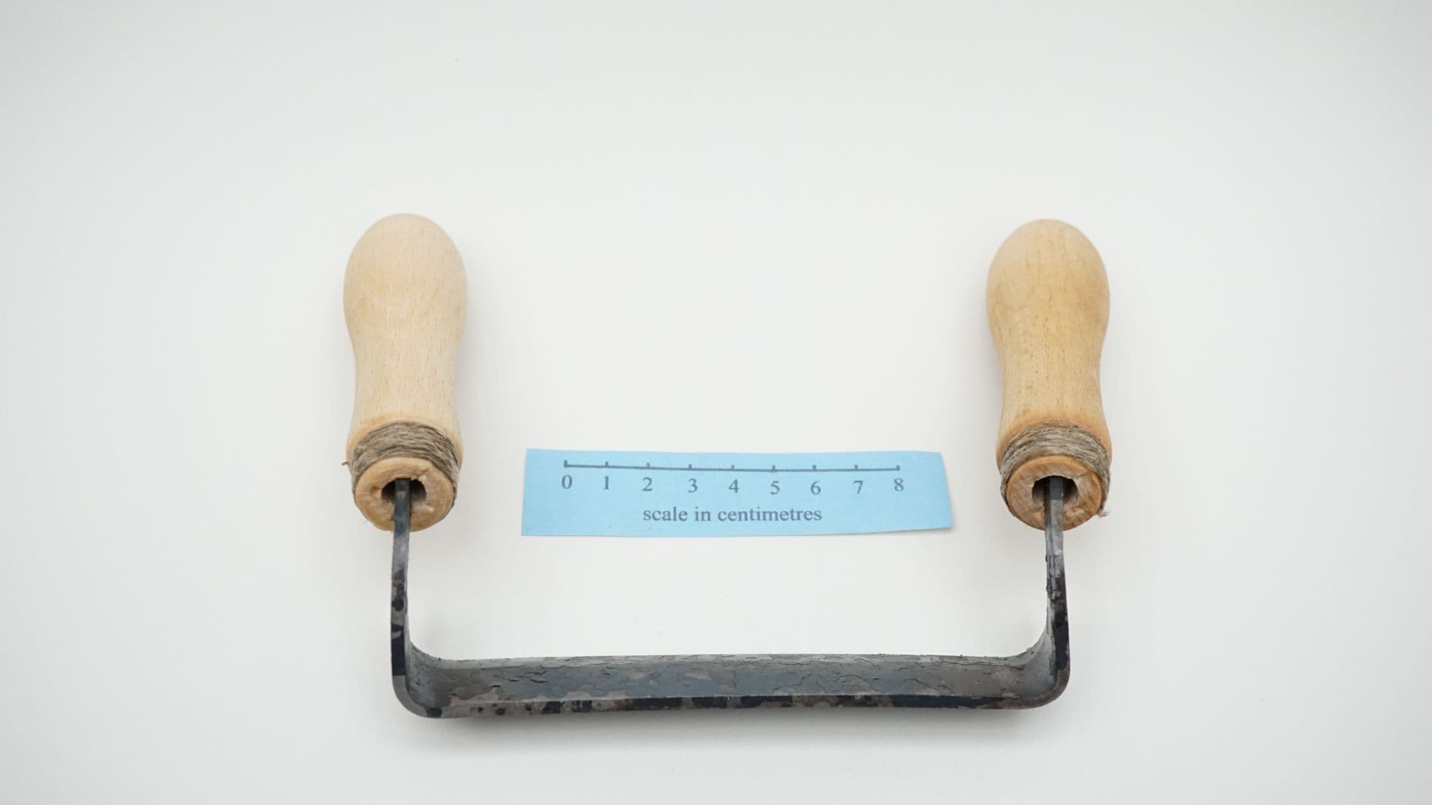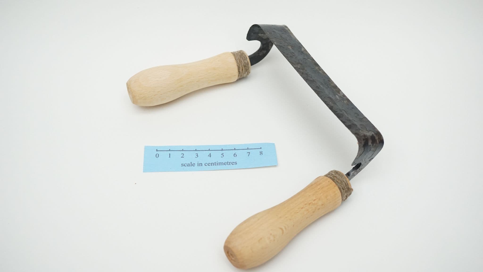 a hand forged plank shave based on find 258, valsgarde 6 boat burial, with a 5" 125mm blade with upturns. the geometry of the shave suggests it was used on planks leaned against a wall rather than flat on a bench, supplied with beechwood handles with flax twine ferrules, made in sheffield england by daegrad tools